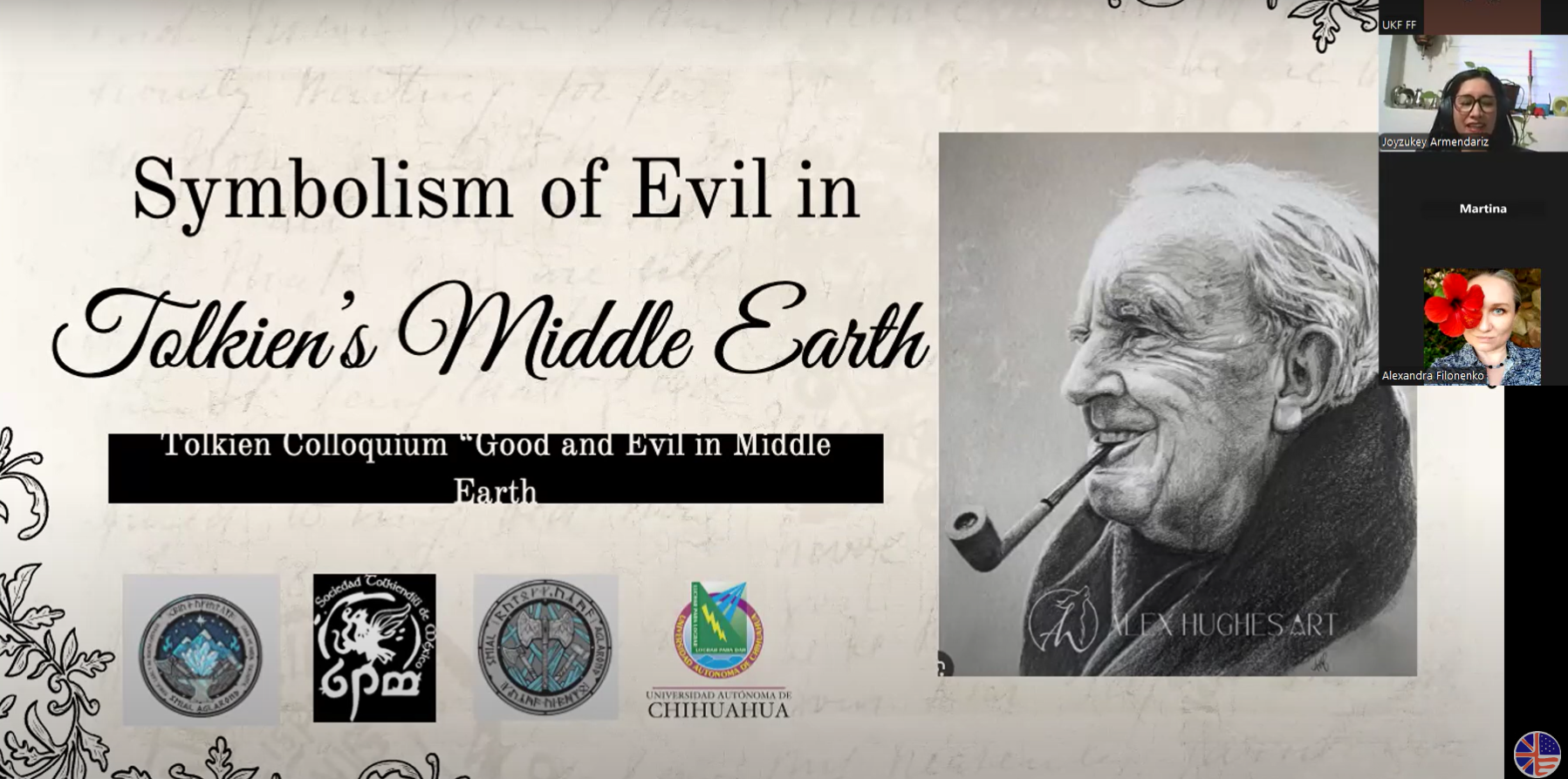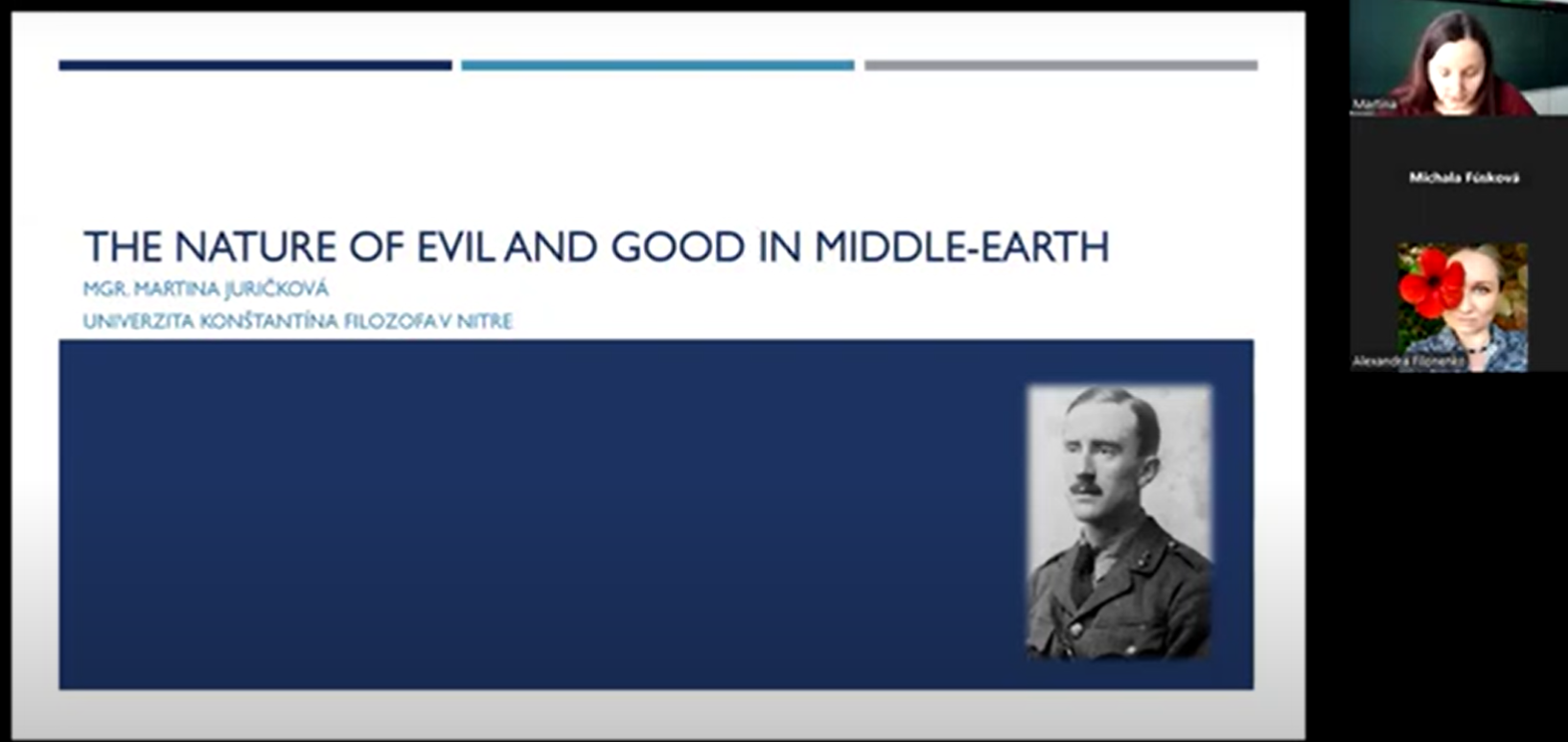 V stredu 19. marca sa konalo medzinárodné online kolokvium, ktorého témou bolo „Dobro a zlo v Stredozemi“. S vlastnými prácami vystúpilo 7 účastníkov, ktorí priblížili rôzne pohľady na stanovenú problematiku. Kolokvium otvorila Dr. Juričková, a to príspevkom „The Nature of Evil and Good in Middle-earth“ a ďalej pokračovali zahraniční prezentujúci. Dr. Alexandra Filonenko z viedenského Inštitútu Fridricha Schillera prispela témou „Gnostic Evil, Hermetic Good: On Competing Worldviews in Tolkien’s Legendarium“. Joyzukey Armendariz z Mexika sa zapojila príspevkom „Symbolism of Evil in Tolkien’s Middle Earth“. Dr. Olena Tykhomyrova z kyjevskej Národnej lingvistickejkej univerzity pokračovala témou „Good and Evil… and Language: Moral Linguistics in Tolkien’s Legendarium“. Z Ústavu manažmentu kultúry a turizmu, kulturológie a etnológie na UKF spoločne prispeli Dr. Michala Fúsková a Bc. Adam Kazár témou „The Freedom of Choice“. Kolokvium uzatvárala Akanksha Chattopadhyay z Indie prácou „‘Master of Doom by Doom Mastered’: Tolkien’s Eucatastrophe and the Problem of Túrin Turambar“.