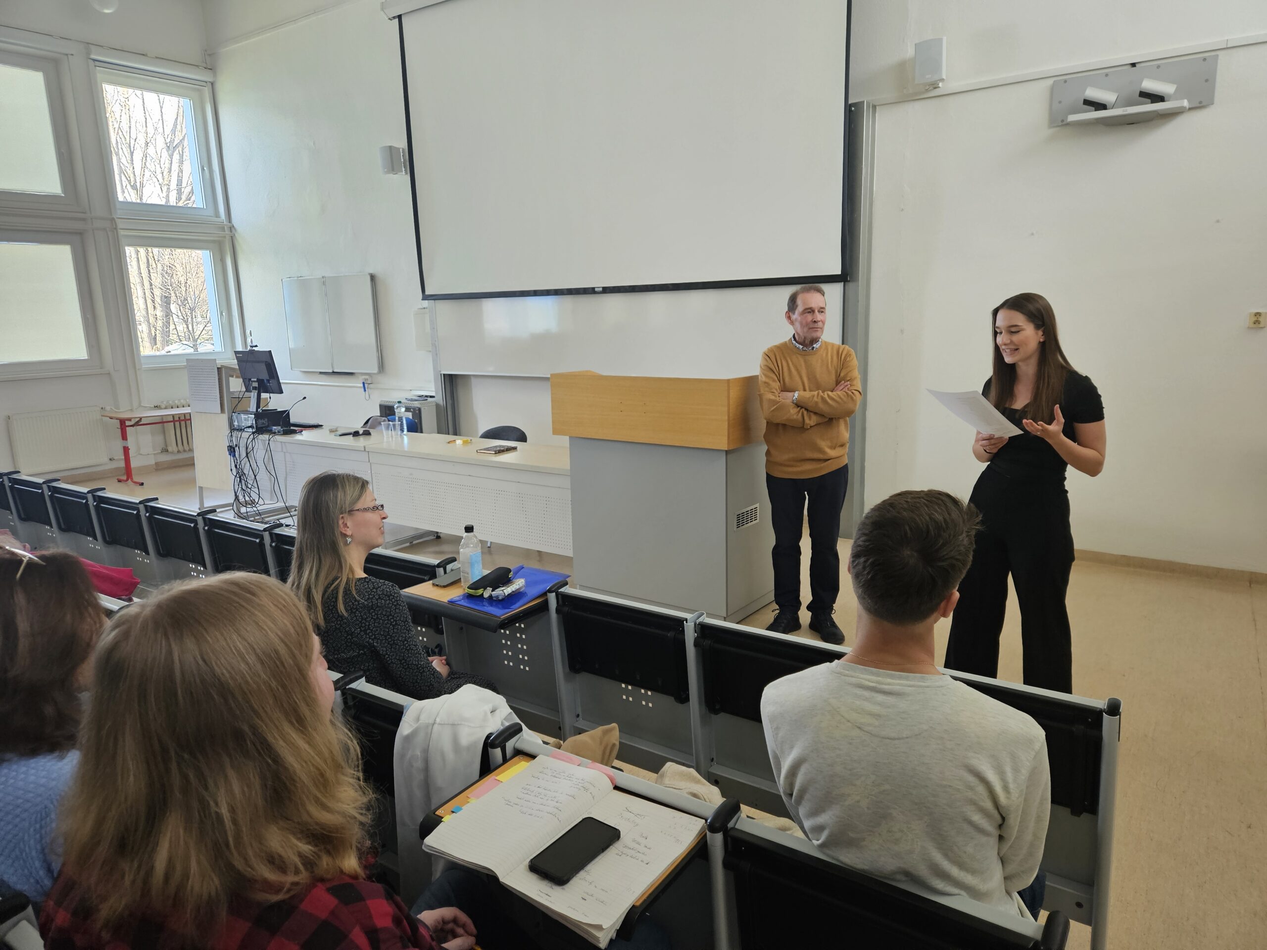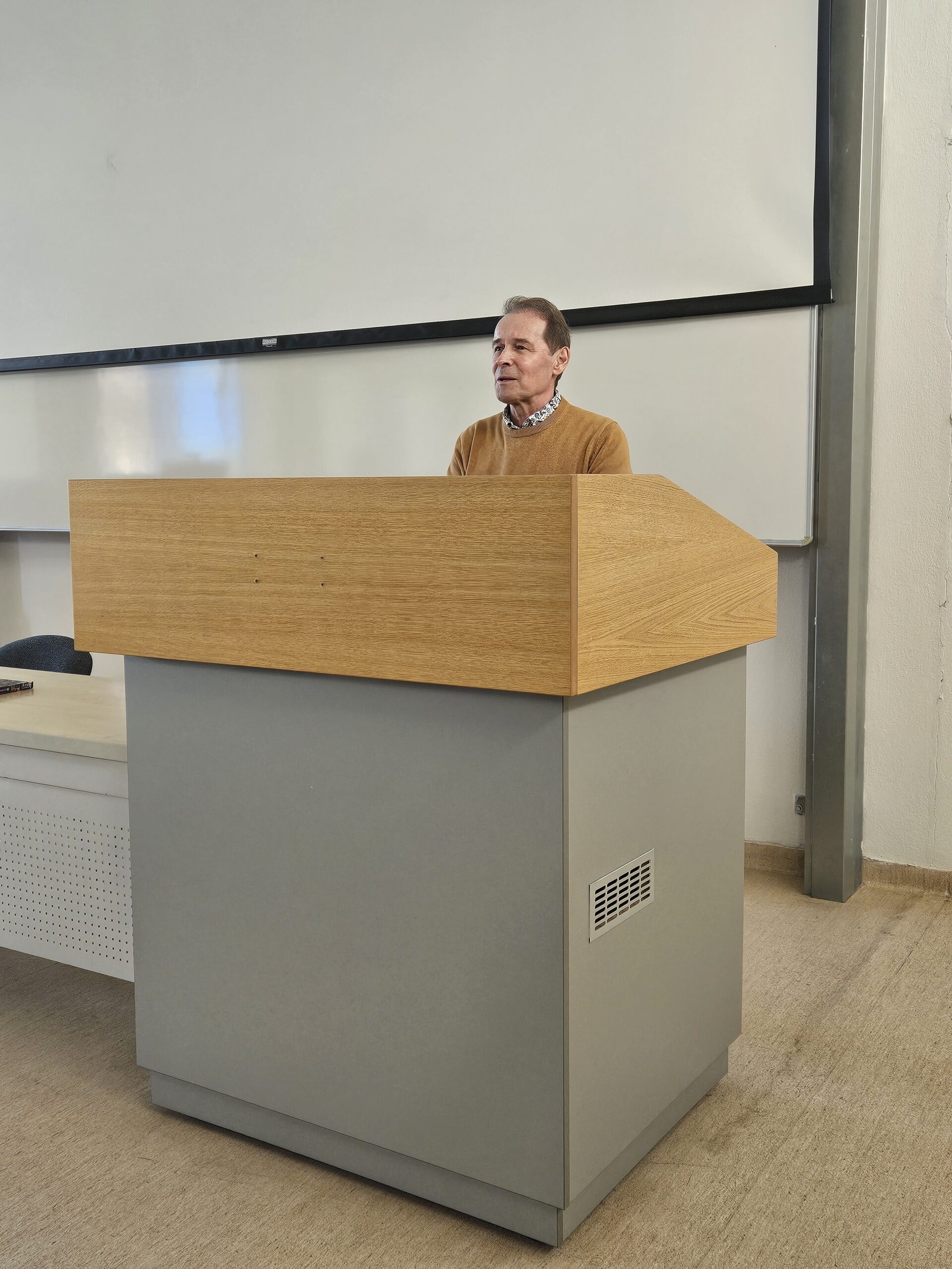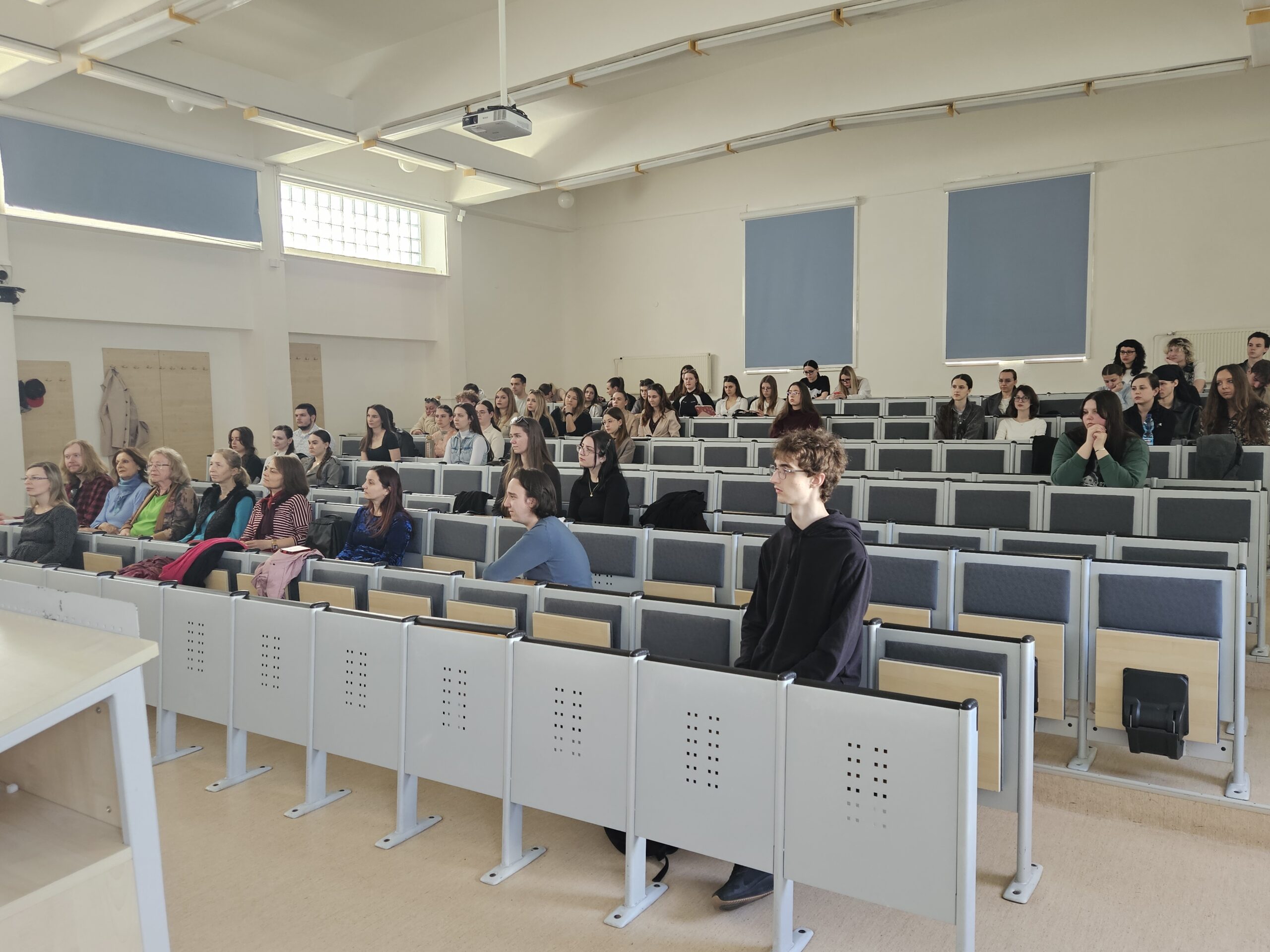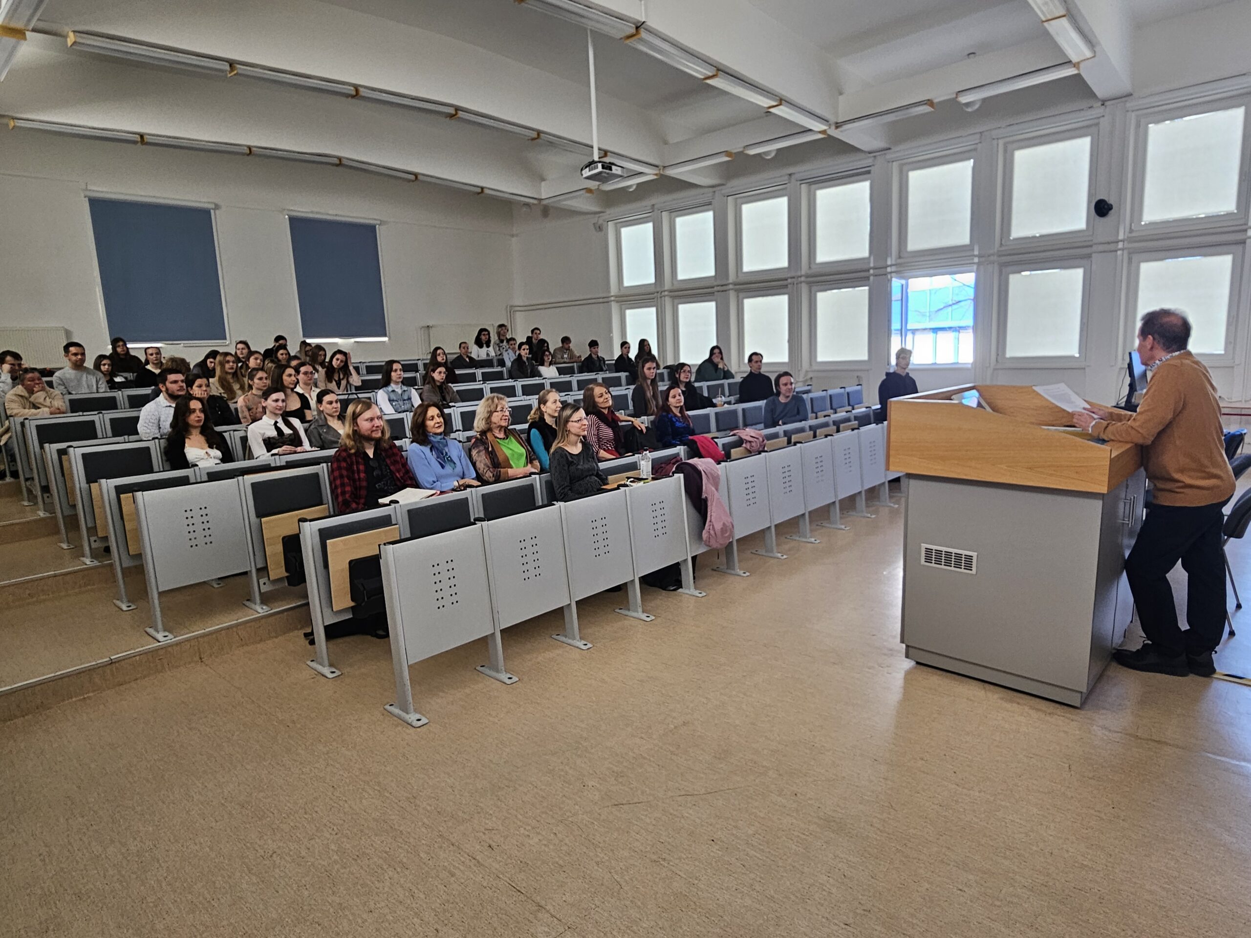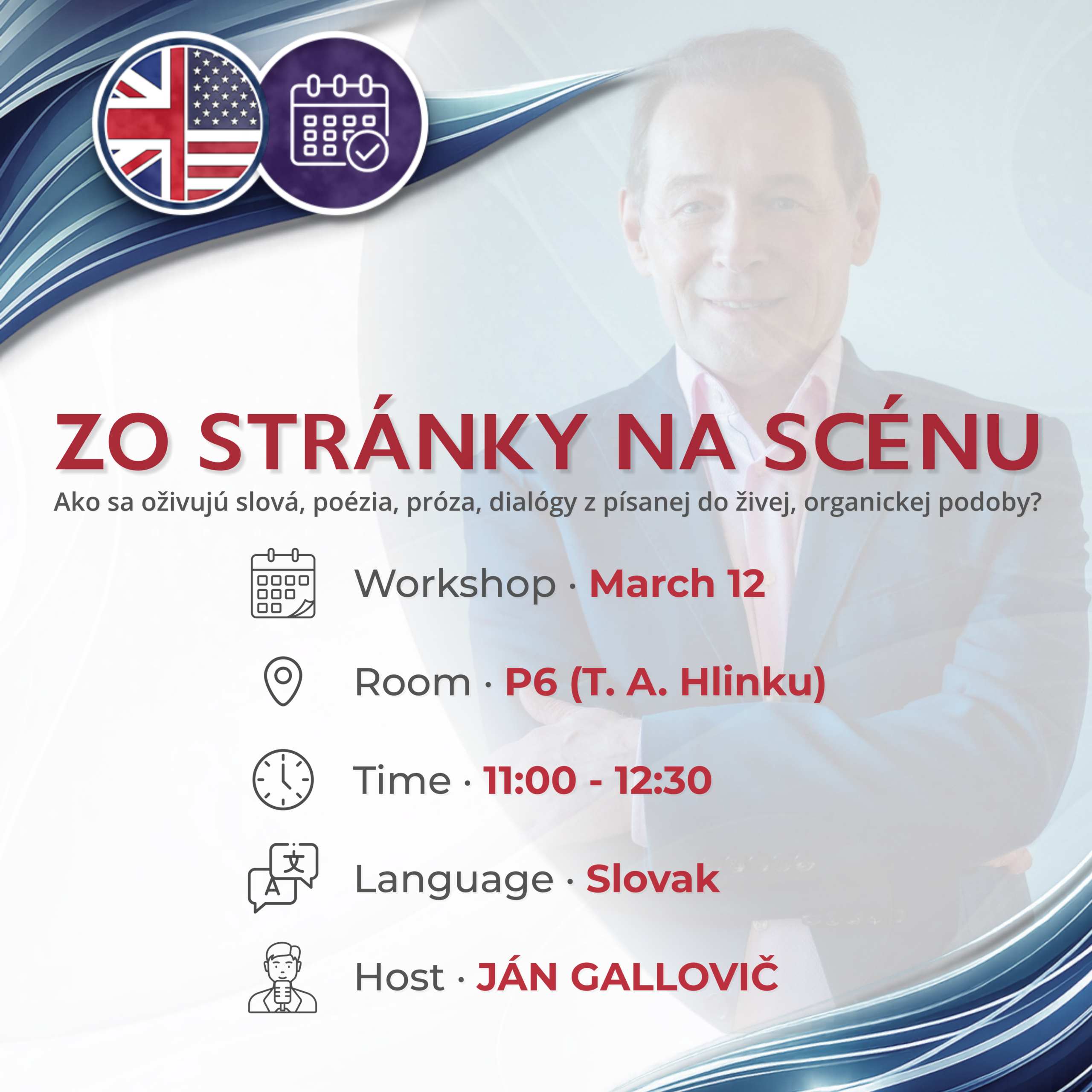 Dňa 12.3. 2026 k nám na pozvanie Katedry anglistiky a amerikanistiky zavítal známy a charizmatický slovenský herec, pán Ján Gallovič, ktorý nám pútavo a zanietene porozprával o tom, čo všetko zahŕňa proces premeny umeleckého diela z textu na papieri na predstavenie na javisku, o rôznych aspektoch hercovej prípravy na uchopenie svojej roly — od jazykovej a pohybovej po mentálnu a emocionálnu prípravu, a taktiež o tom, ako je možné tieto herecké schopnosti a skúsenosti využiť aj v iných povolaniach, zdôrazňujúc najmä to učiteľské. Jeho prednáška bola tak zaujímavá a podnetná, že sme sa ani nenazdali, ako rýchlo ubehol čas, pričom pán Gallovič ani nestihol odprezentovať všetko, čo mal v pláne. Dúfame teda, že ho na našej akademickej pôde budeme môcť v skorej budúcnosti opäť privítať.
